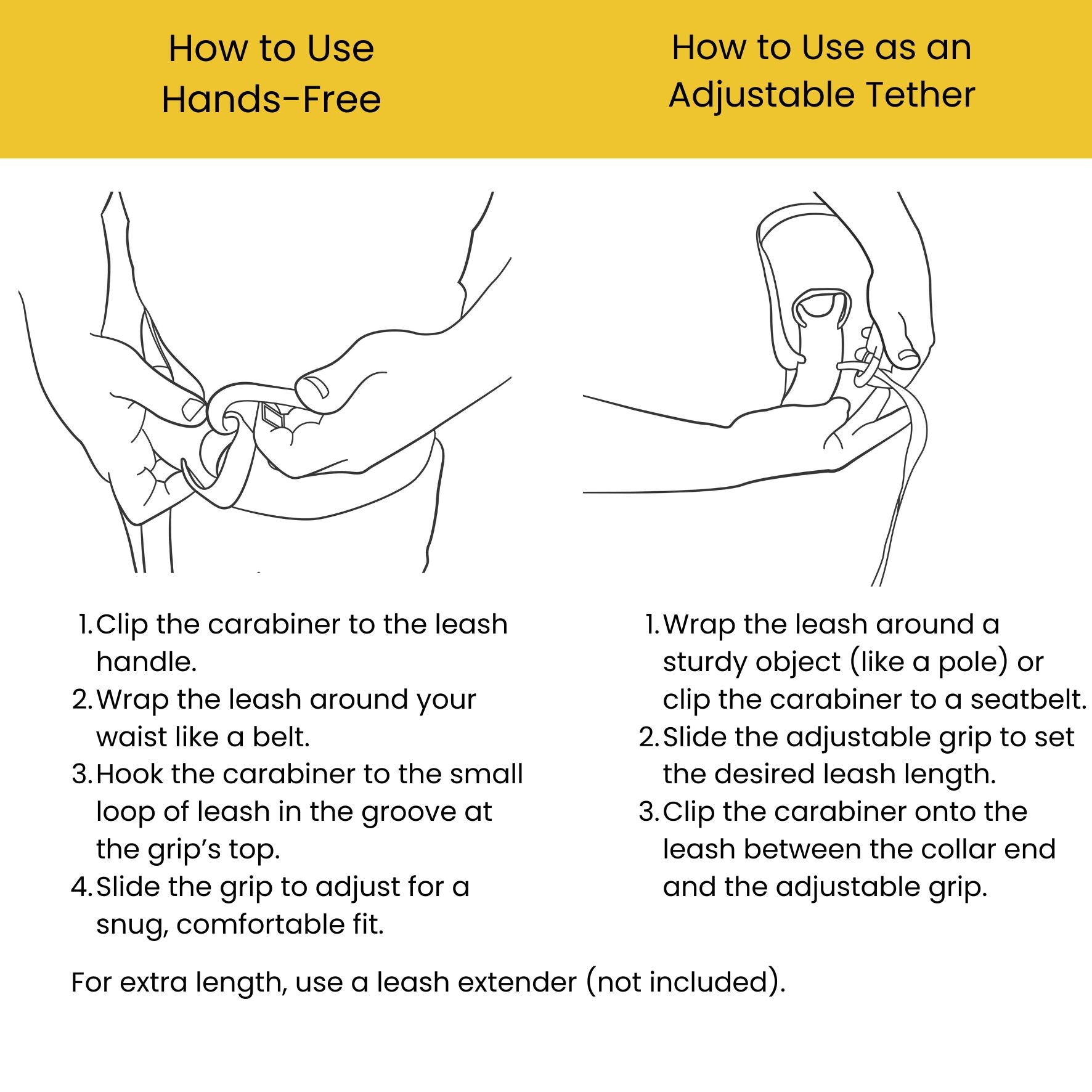 Once your dog is trained not to pull, this leash converts to hands-free mode. Simply wrap it around your waist, adjust the fit, and secure it with the carabiner for easy, controlled adventures.
